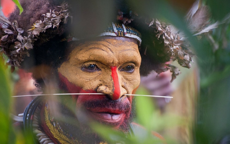 A man of the Indigenous Huli tribe from the highlands of Papua New Guinea is preparing for a traditional ceremony.