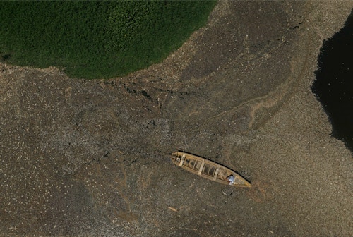 Community leader Erick Penna Ribeiro navigates a canoe through a section of the Igarapé do Pitomba covered with dead fish in the floodplain area of the Amazon River, Santarém (PA). Photo: Lalo de Almeida/Folhapress.