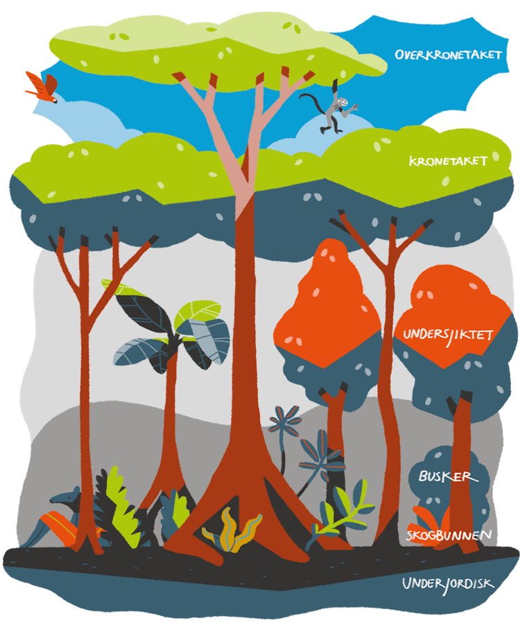 For når et av de store trærne fra de øverste sjiktene må gi tapt og faller til bakken, strømmer lyset ned på skogbunnen – til glede for de som har ligget i dvale og ventet. Bunnlaget nederst består ikke av kompost slik som i norske skoger. Organisk materiale blir raskt brutt ned av bakterier, sopp og insekter.
